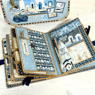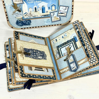 Kristine has created two new mini albums. Her first mini album features Graphic 45's The Beach is Calling collection. She has also created a suitcase to store the mini album in. We're sure you will want to check out both the album and the suitcase. She used one of our Graphic 45 - The Beach is Calling bundles. However, we are unable to make additional bundles, since the Patterns & Solids are no longer available from Graphic 45. If you are interested in making Kristine's album and suitcase, we can create a bundle for you by substituting an additional package of the 12 x 12 core designs. Many of the core design back sides can be substituted for the Patterns & Solids. Contact us if you are interested in a custom bundle. Click on the first image in the collage, below, to view larger images of each photo.