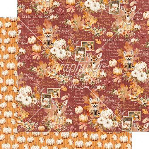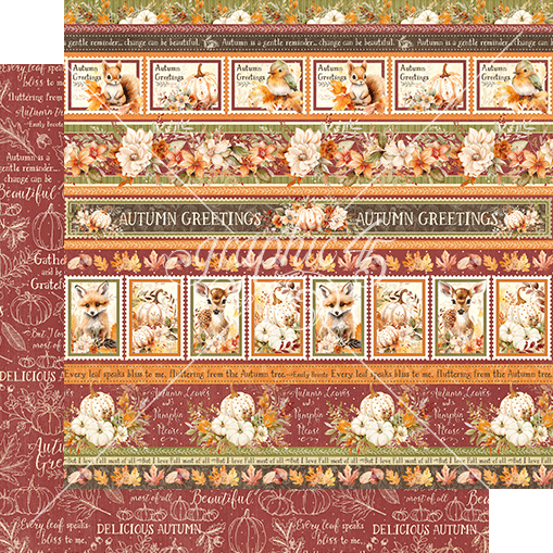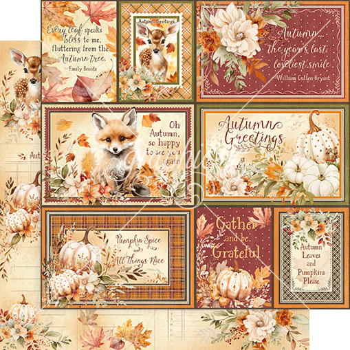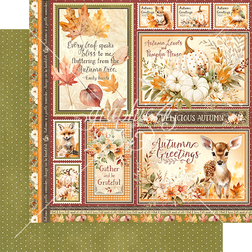 Graphic 45's Autumn Greetings collection features images of woodland animals, autumn leaves and pumpkins in the warm colors of olive green, burgundy, orange and mocha brown. We hope you will embrace the essence of fall with this wonderful new collection. Click on the first image in the collage, below, to view larger images of each photo.